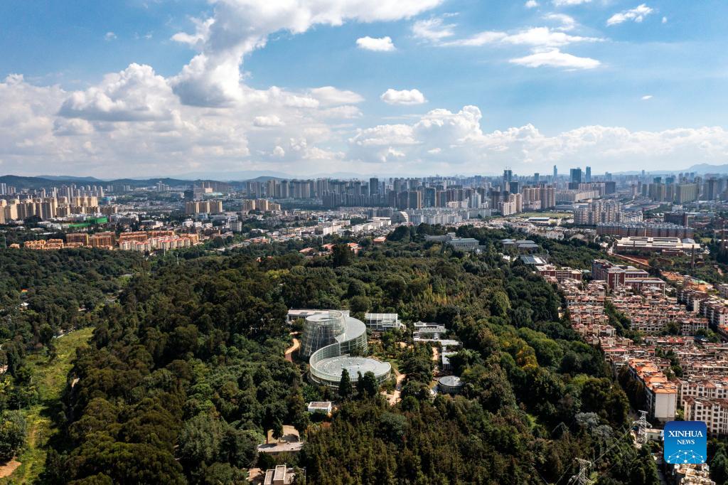 Aerial photo taken on Sept. 26, 2021 shows the view of the Fuligong Greenhouses at Kunming Botanical Garden in Kunming, southwest China's Yunnan Province. (Xinhua/Jiang Wenyao)