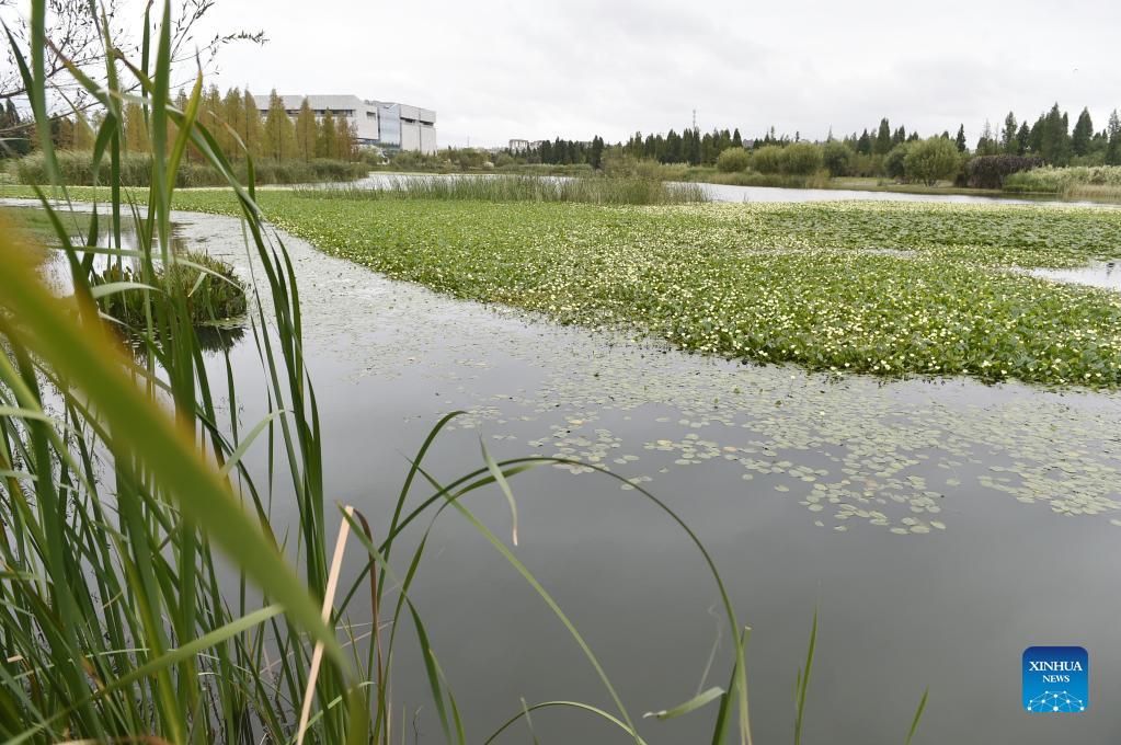 Photo taken on Oct. 15, 2021 shows a view of the Baofeng Peninsula Wetland in Kunming, southwest China's Yunnan Province. The wetland, about 108 hectares in size, is an outdoor exhibition project for the 15th meeting of the Conference of the Parties to the Convention on Biological Diversity, or the COP15. (Xinhua/Lu Peng)