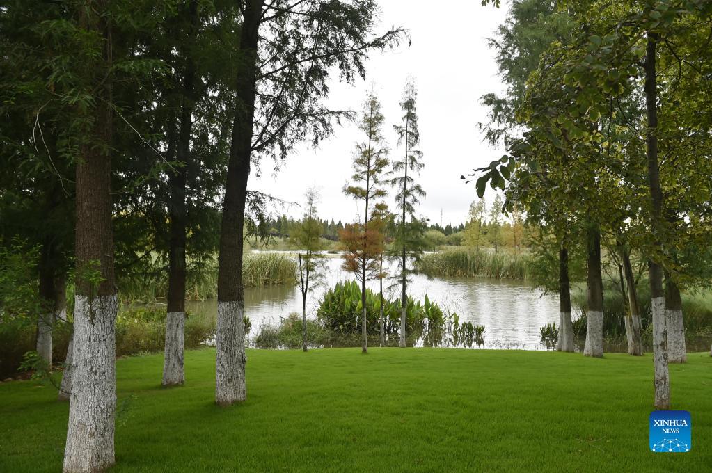 Photo taken on Oct. 15, 2021 shows a view of the Baofeng Peninsula Wetland in Kunming, southwest China's Yunnan Province. The wetland, about 108 hectares in size, is an outdoor exhibition project for the 15th meeting of the Conference of the Parties to the Convention on Biological Diversity, or the COP15. (Xinhua/Lu Peng)