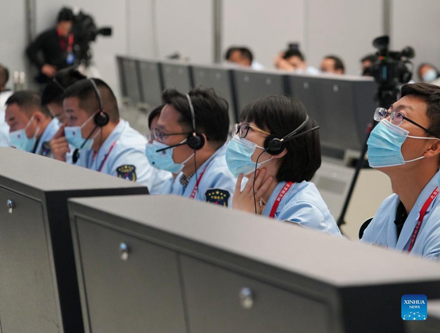 Technical personnel monitor China's Shenzhou-13 crewed spaceship docking with the radial port of the space station core module Tianhe at Beijing Aerospace Control Center in Beijing, capital of China, Oct. 16, 2021. China's Shenzhou-13 crewed spaceship successfully docked with the radial port of the space station core module Tianhe on Saturday, according to the China Manned Space Agency. (Xinhua/Tian Dingyu)