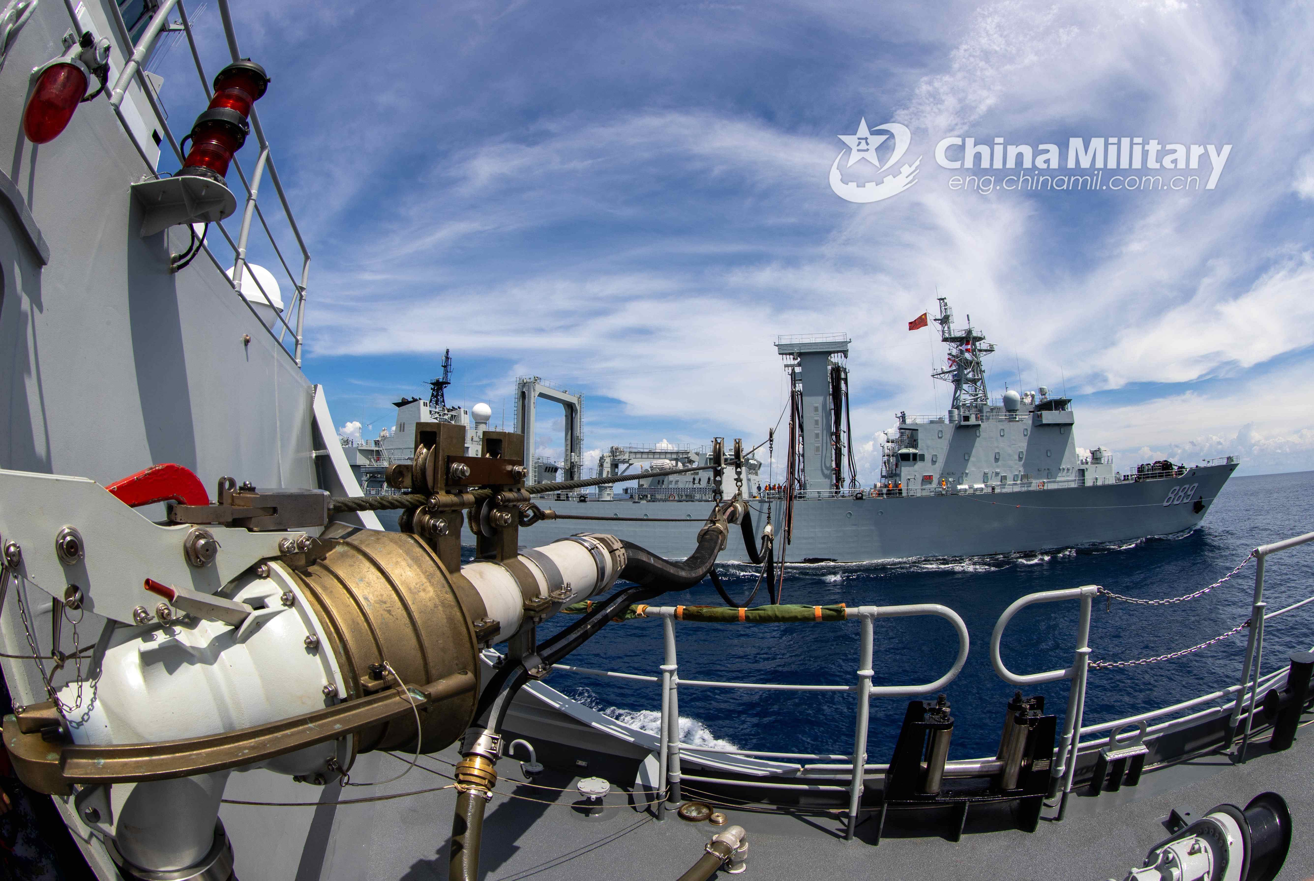 Sailors assigned to the 39th Chinese naval escort taskforce connect a fuel probe from the comprehensive supply ship Taihu (Hull 889) to their ship during a replenishment-at-sea operation in waters of the South China Sea on October 1, 2021. The 39th Chinese naval escort taskforce is composed of the guided-missile destroyer Urumqi (Hull 118), guided-missile frigate Yantai (Hull 538), and comprehensive supply ship Taihu (Hull 889), together with two shipborne helicopters and dozens of special operations soldiers. It is the first time for Destroyer Urumqi to carry out the escort mission. (eng.chinamil.com.cn/Photo by Zhao Yang)