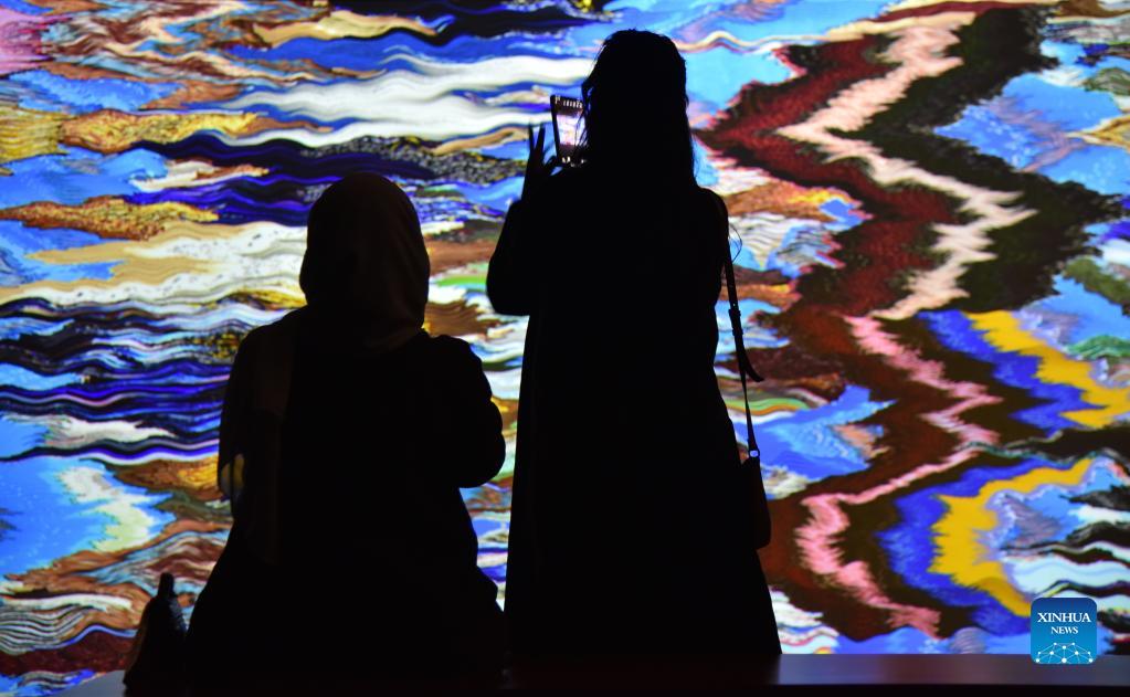 Visitors watch an video installation at the BIENALSUR exhibition in JAX, Diriyah, Riyadh, Saudi Arabia, on Oct. 16, 2021. The exhibition opened for public on Saturday in Diriyah under the title "Echoes: A World Between Analogue &Virtual". (Xinhua/Wang Haizhou)