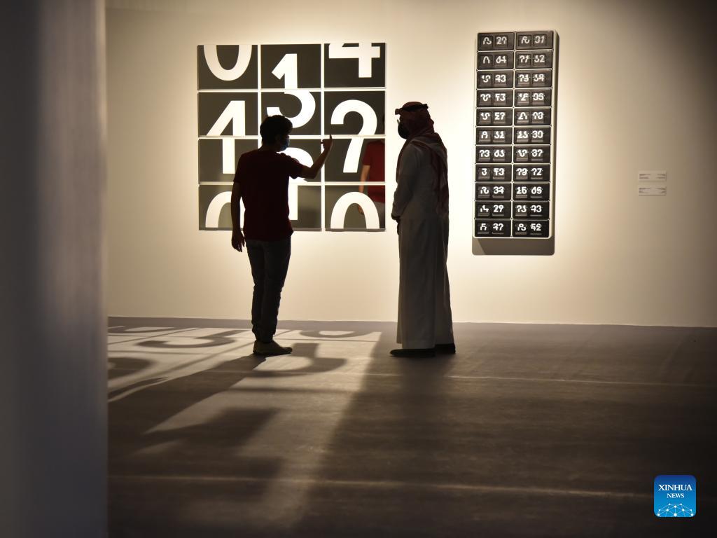 People visit the BIENALSUR exhibition in JAX, Diriyah, Riyadh, Saudi Arabia, on Oct. 16, 2021. The exhibition opened for public on Saturday in Diriyah under the title "Echoes: A World Between Analogue &Virtual". (Xinhua/Wang Haizhou)