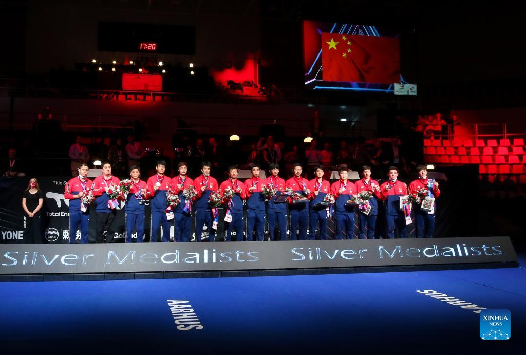 Members of China attend the awarding ceremony after the final match between China and Indonesia at Thomas Cup badminton tournament in Aarhus, Denmark, Oct. 17, 2021. (Xinhua/Zhang Cheng)