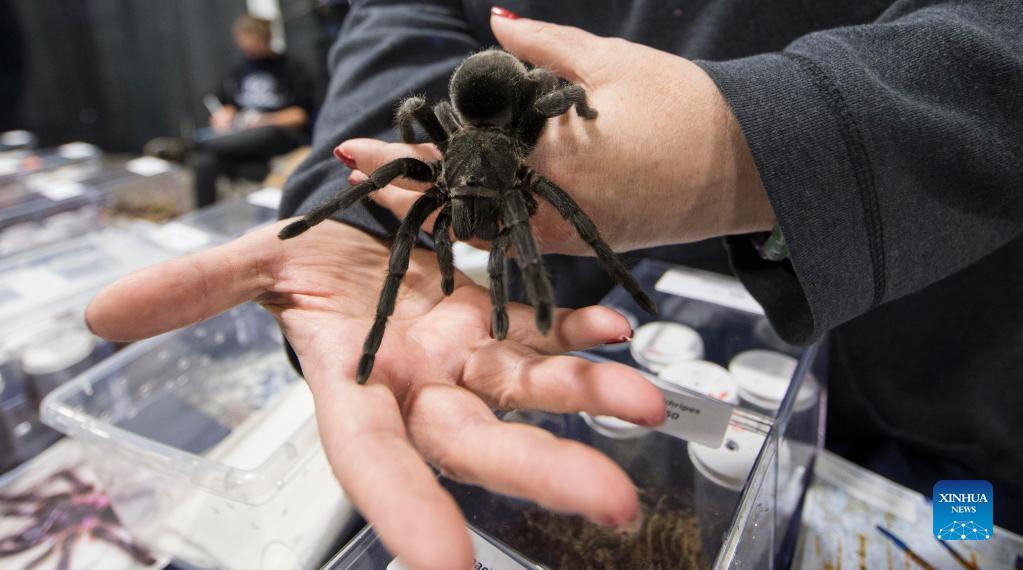 A pet tarantula is seen during the 2021 Toronto Reptile Expo at the International Center in Mississauga, the Greater Toronto Area, Canada, on Oct. 17, 2021. Kicking off on Sunday, this event provided an opportunity to view species of reptilian specialty pets from across Canada. (Photo by Zou Zheng/Xinhua)