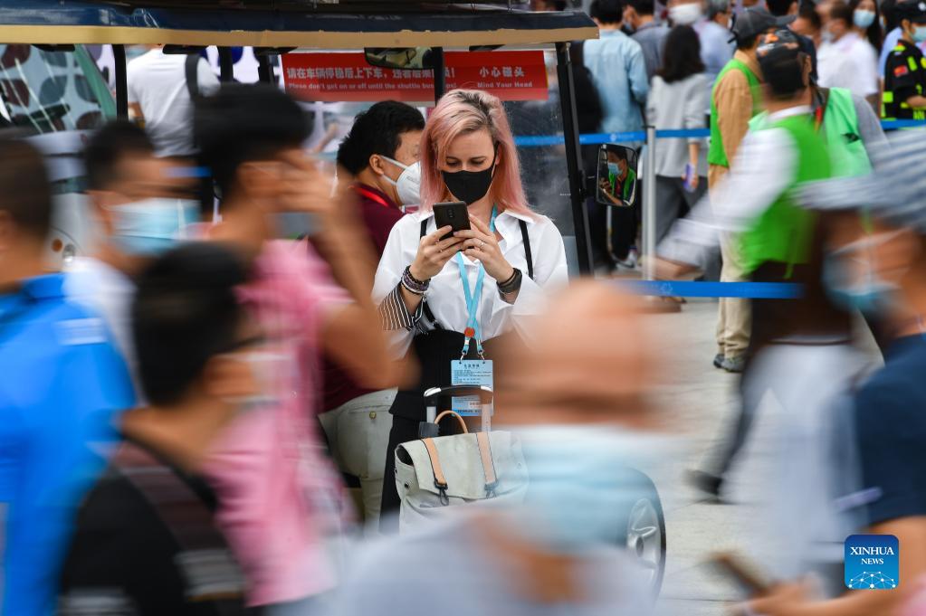 Italian designer Laura Minmini (C) visits the 130th session of the China Import and Export Fair, also known as the Canton Fair in Guangzhou, south China's Guangdong Province, Oct. 15, 2021. Laura Minmini is a professional designer specialized in industrial design. After working in Italy for years, Laura landed in China where she has found a dynamic and similar environment. Up to now, she has been working and living in Shunde of Guangdong Province for more than three years, and has founded a design company with her Chinese business partner. The ongoing Canton Fair offers Laura an opportunity to meet old friends from at home and abroad, and to see the latest trend of industrial design in the world. (Xinhua/Liu Dawei)