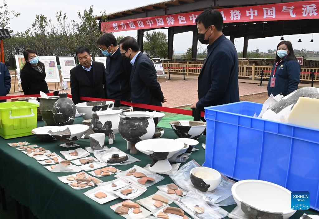 Archaeological experts watch excavated relics at the Yangshao Village national archaeological park in Mianchi County, central China's Henan Province, Oct. 17, 2021. The park officially opened to public here on Sunday. In 1921, the first excavation on the Yangshao Village site, which is in Mianchi County, Henan Province, marked the birth of Chinese archaeology. The name of China's first-known archaeological culture, the Yangshao Culture, was also derived from the site. In 1951 and 1980, China launched the second and third excavation of the ruins. Originating around the middle reaches of the Yellow River, the Yangshao Culture is considered an important stream of Chinese civilization, and is widely known for its advanced pottery-making technology. The fourth archaeological excavation of the Yangshao Village site began on Aug. 22, 2020, and is still in progress. (Xinhua/Li He)