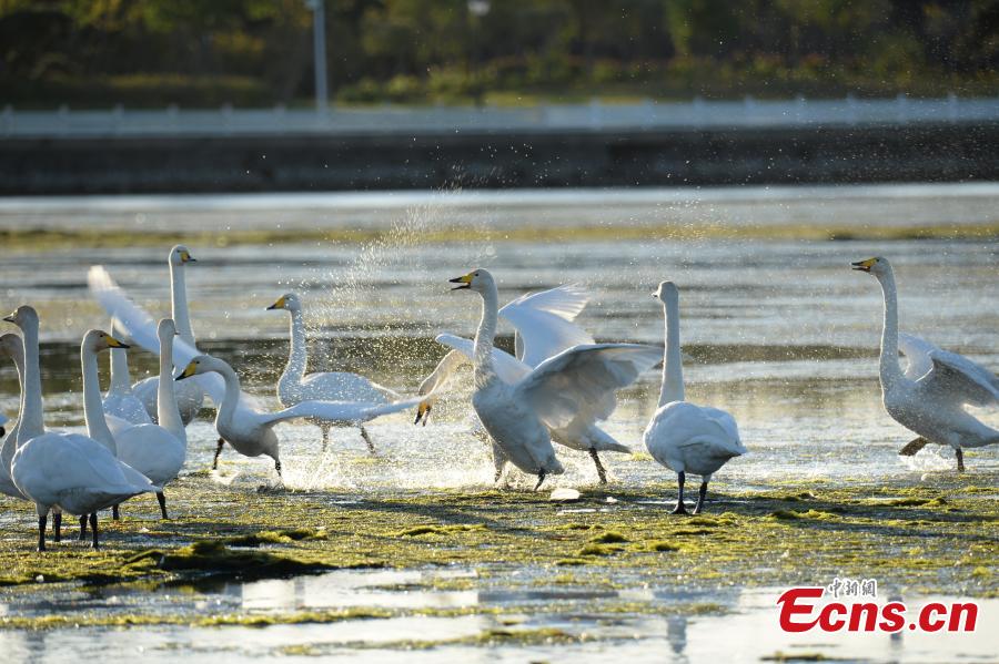 Photo taken on Oct. 17, 2021 shows the whooper swans at the national nature reserve for whooper swans in Rongcheng City, east China's Shandong Province. (Photo: China News Service/Yang Zhili)