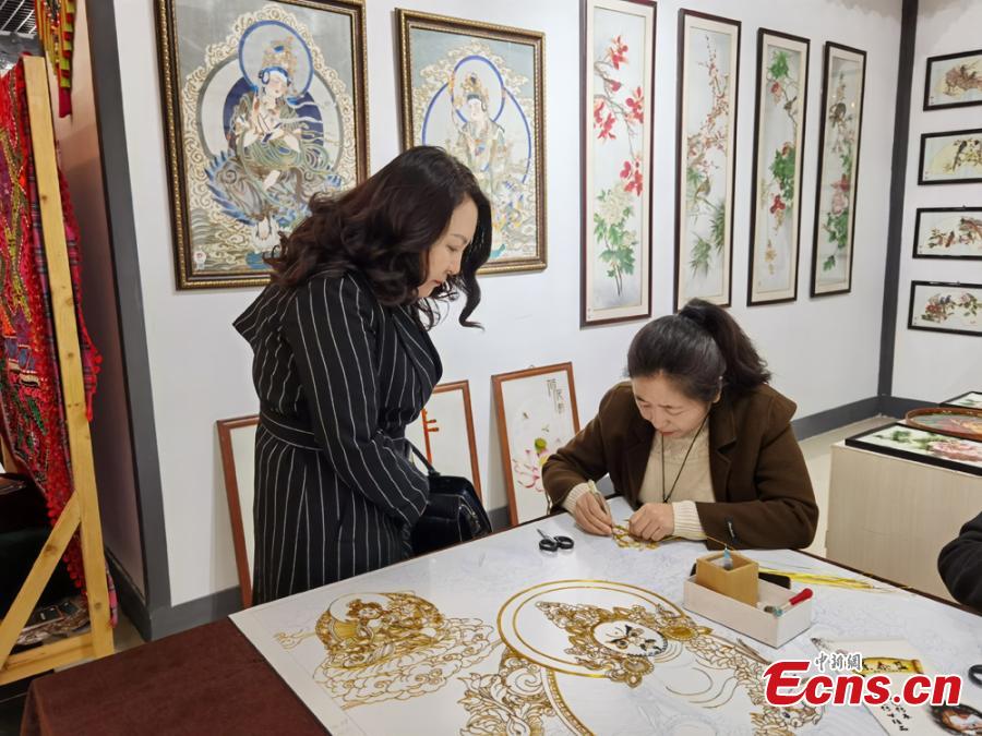 A craftswoman demonstrates wire-inlay painting at a local exhibition in Lanzhou, Guasu Province, Oct. 17, 2021.