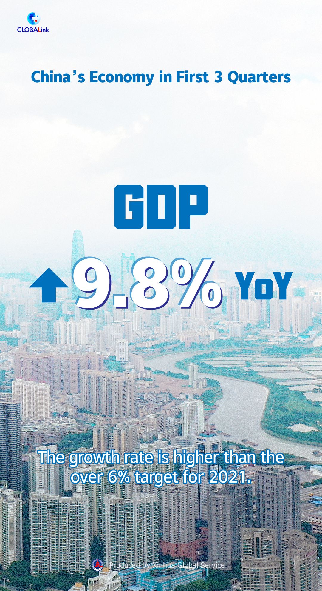 The country's gross domestic product (GDP) reached 82.31 trillion yuan (about 12.8 trillion U.S. dollars) in the first three quarters, expanding 9.8 percent year on year. It is well above its annual growth target of "over 6 percent," data from the National Bureau of Statistics (NBS) showed.