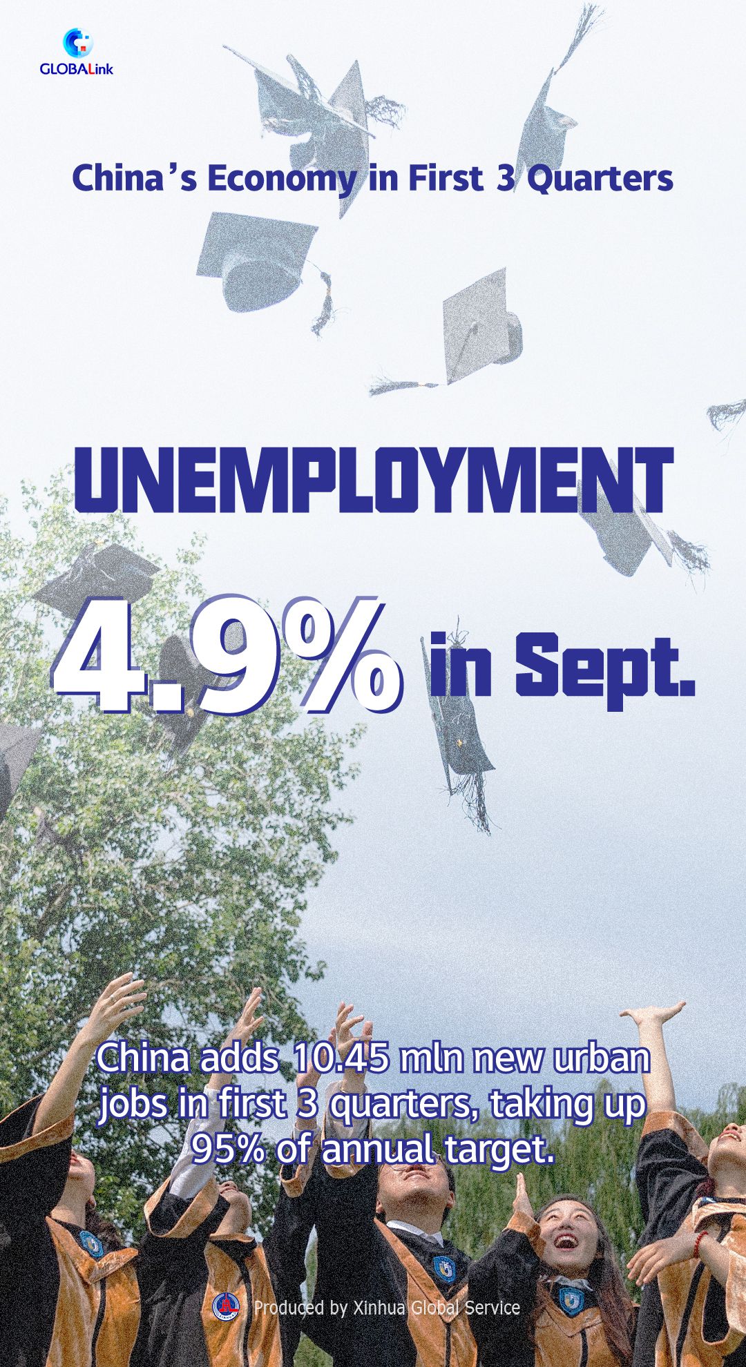 The country's surveyed urban unemployment rate stood at 4.9 percent in September, 0.5 percentage points lower than the same period last year.