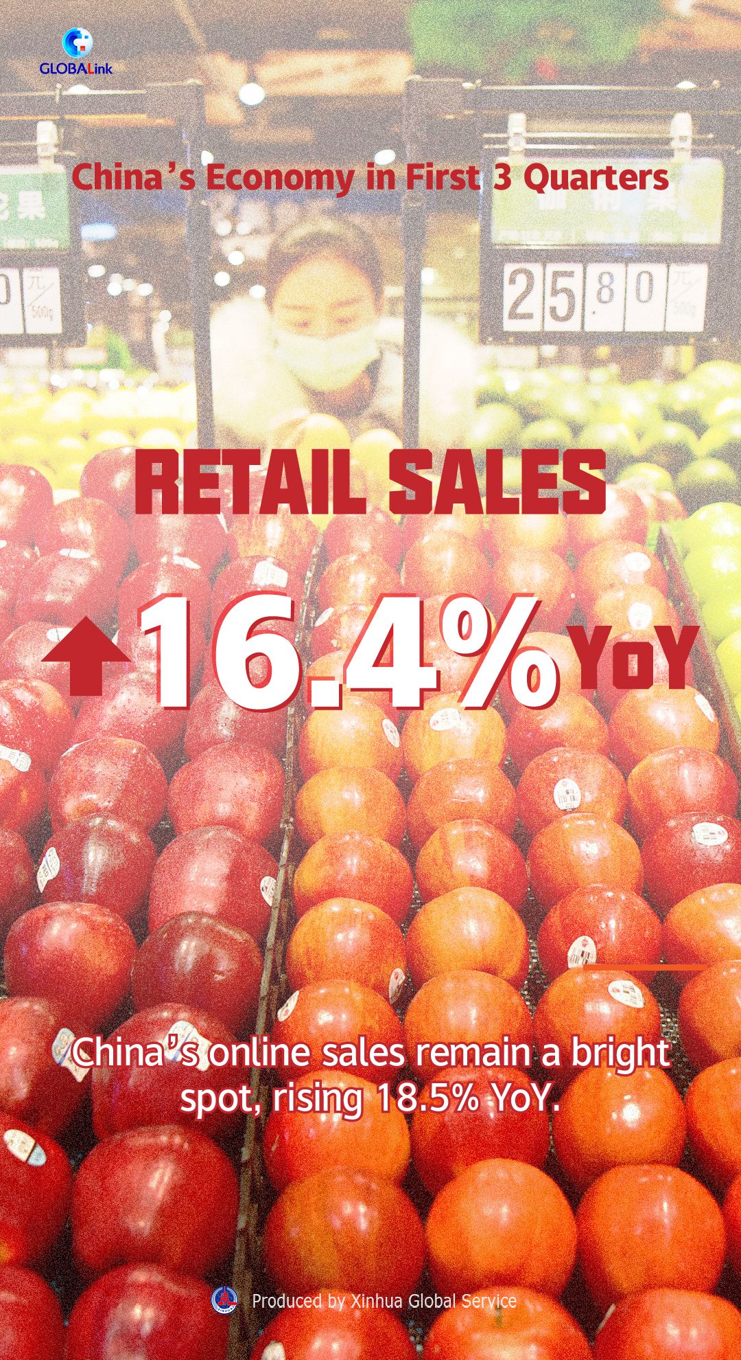 Monday's data pointed to many bright spots in the economy. Retail sales of consumer goods jumped 16.4 percent year on year in the first three quarters this year, with online retail sales surging 18.5 percent.