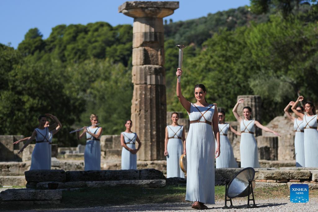 Greek actress Xanthi Georgiou, playing the role of an ancient Greek High Priestess, presents the torch during the Olympic flame lighting ceremony for the Beijing 2022 Winter Olympic Games, in ancient Olympia, Greece, Oct. 18, 2021. (Xinhua/Zheng Huansong)