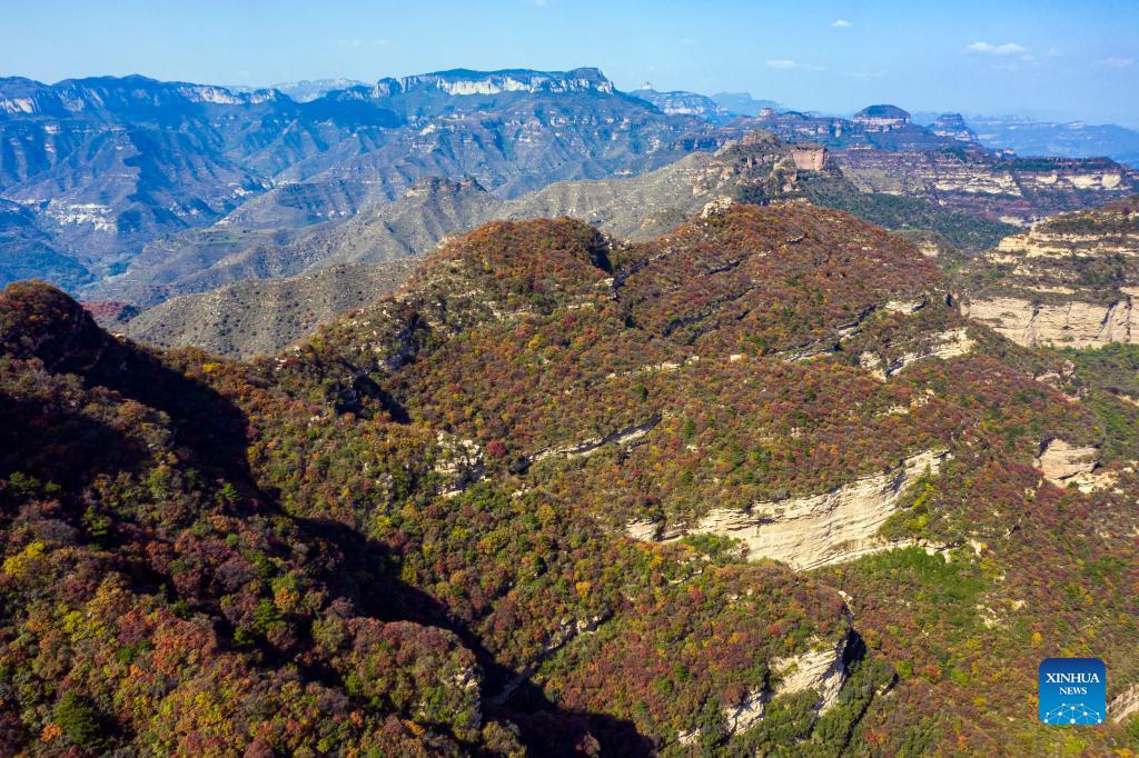 Aerial photo taken on Oct. 18, 2021 shows the autumn scenery at Baiyun mountain scenic spot in Wuan City, north China's Hebei Province. (Xinhua/Luo Xuefeng)