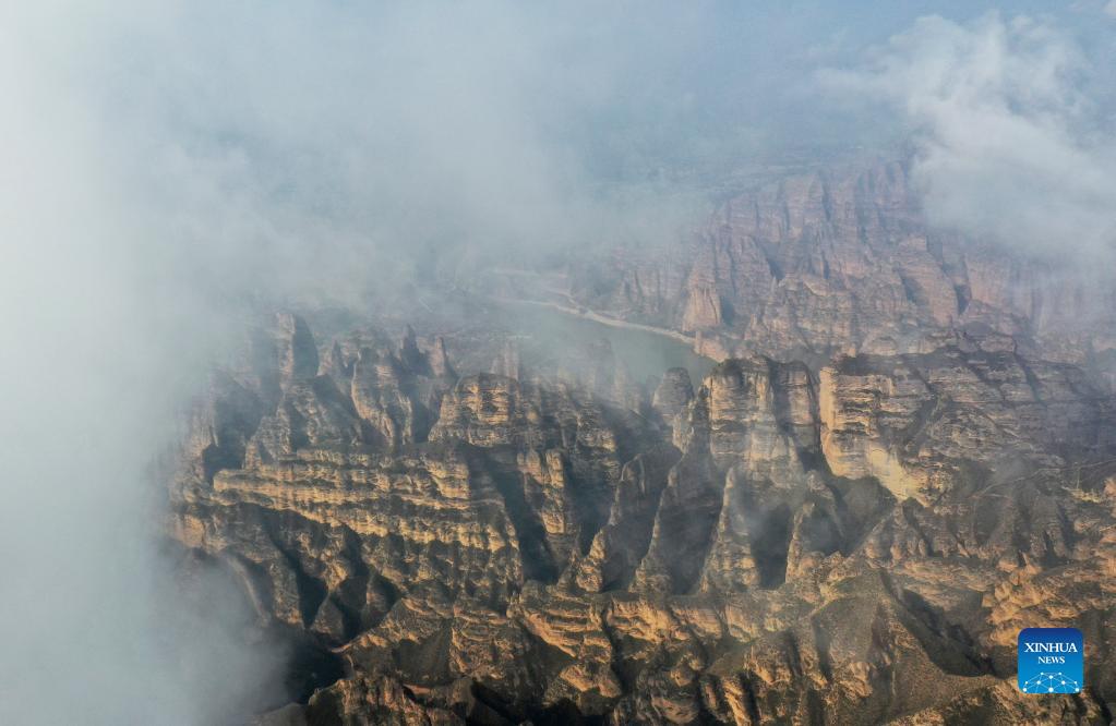 Aerial photo taken on Oct. 18, 2021 shows the scenery at Bingling Danxia National Geological Park in Yongjing County, northwest China's Gansu Province. (Photo by Shi Youdong/Xinhua)