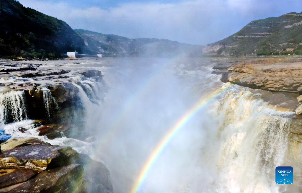Aerial photo taken on Oct. 18, 2021 shows a rainbow over the Yellow River's Hukou Waterfall in northwest China's Shaanxi Province. (Xinhua/Tao Ming)