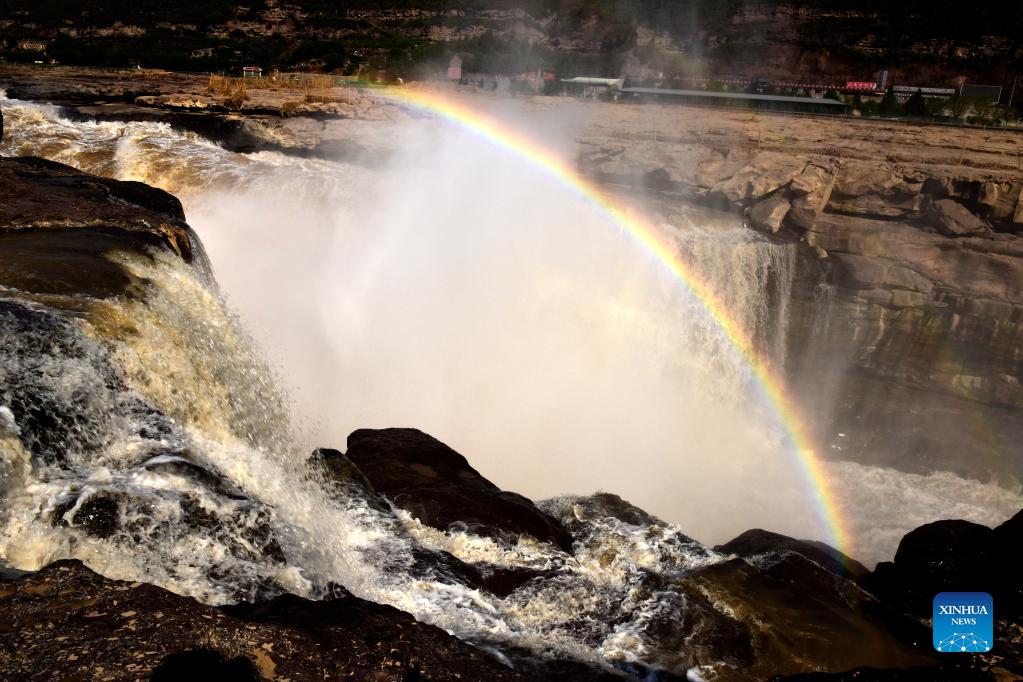 Photo taken on Oct. 18, 2021 shows a rainbow over the Yellow River's Hukou Waterfall in northwest China's Shaanxi Province. (Xinhua/Zhu Xiang)