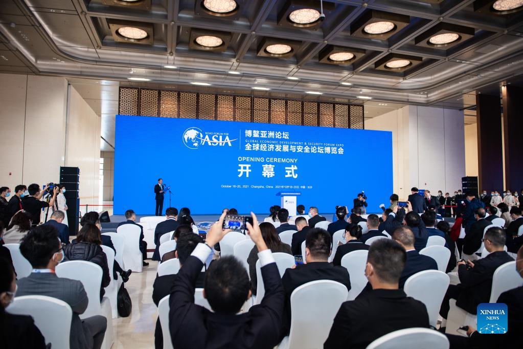 The Global Economic Development and Security Forum Expo of the Boao Forum for Asia (BFA) opens in Changsha, central China's Hunan Province, Oct. 18, 2021. With the theme of economic security and sustainable development in a world of great change, the three-day forum aims to provide a high-end platform for promoting dialogue between political and business leaders from around the world. (Xinhua/Chen Sihan)