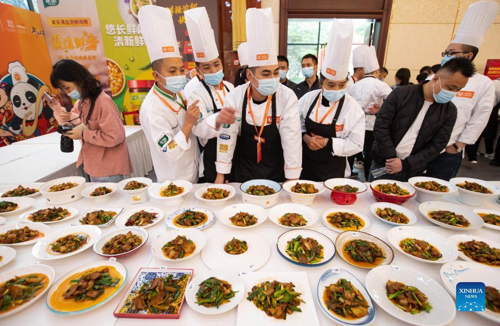 Chefs display traditional Sichuan dishes during a Sichuan cuisine skills competition in Chengdu, capital of southwest China's Sichuan Province, Oct. 18, 2021. The 2021 World Sichuan Cuisine Conference kicked off on Monday in Pidu District of Chengdu City, during which chefs show the trending culinary skills of Sichuan cuisines. (Xinhua/Jiang Hongjing)