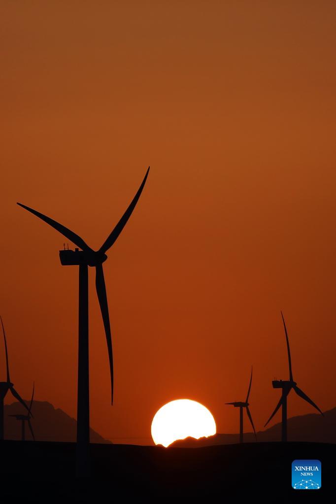 Windmills are silhouetted against the sunset in Hurghada, Egypt, on Oct. 18, 2021. (Xinhua/Ahmed Gomaa)