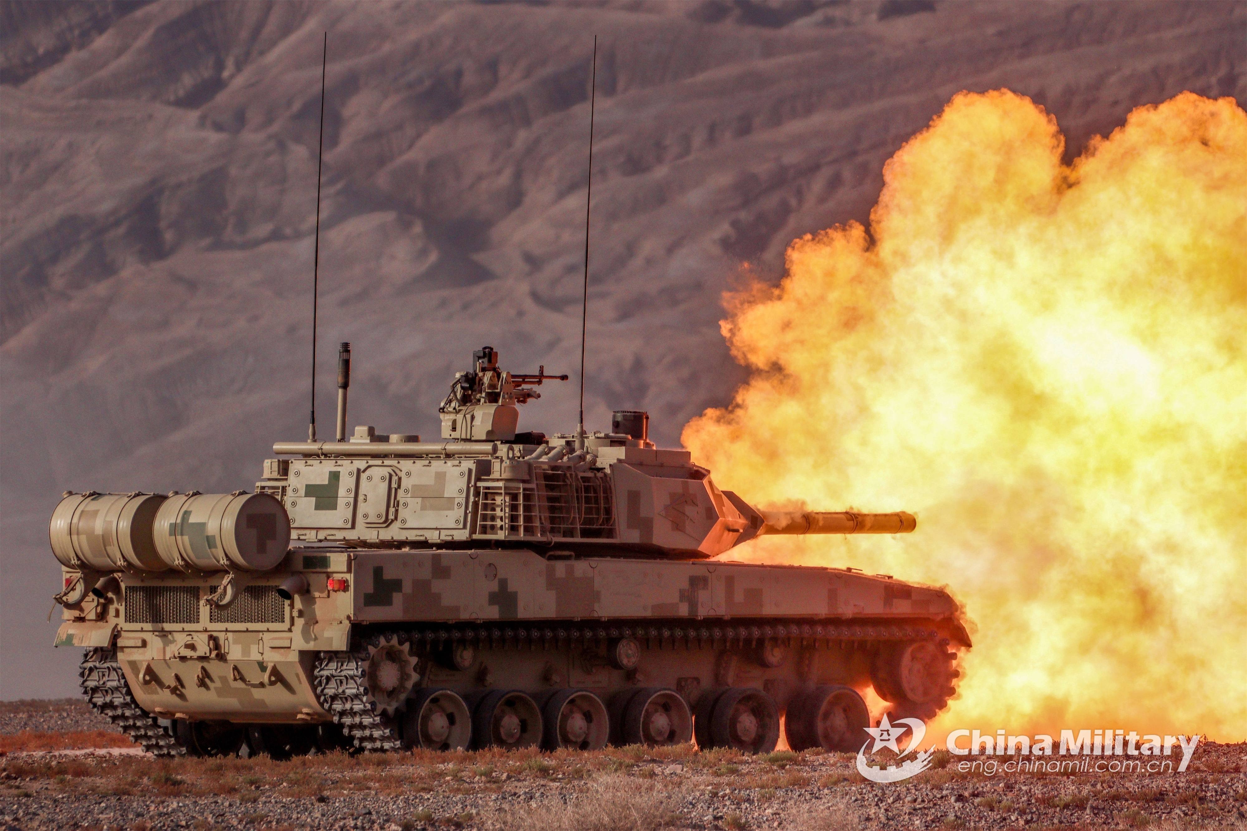 A main battle tank (MBT) attached to a combined-arms regiment under the PLA Xinjiang Military Command fires its main gun at mock targets during a live-fire training exercise on September 27, 2021. (eng.chinamil.com.cn/Photo by Chen Ming)