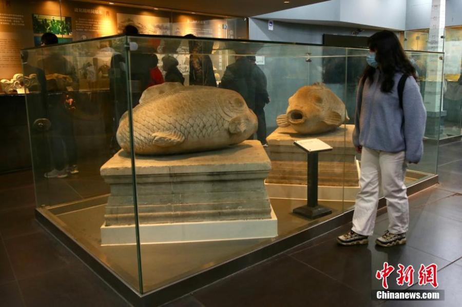 A girl watches the fish sculptures of the Dashuifa Site, Oct. 18, 2021. (Photo: China News Service/Yi Haifei)