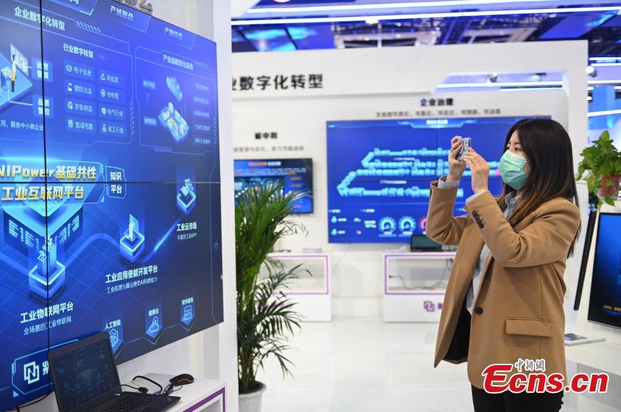 A visitor takes photos at the innovation achievements exhibition of the 2021 Global Industrial Internet Conference, Oct. 18, 2021. (Photo: China News Service/Yu Haiyang)