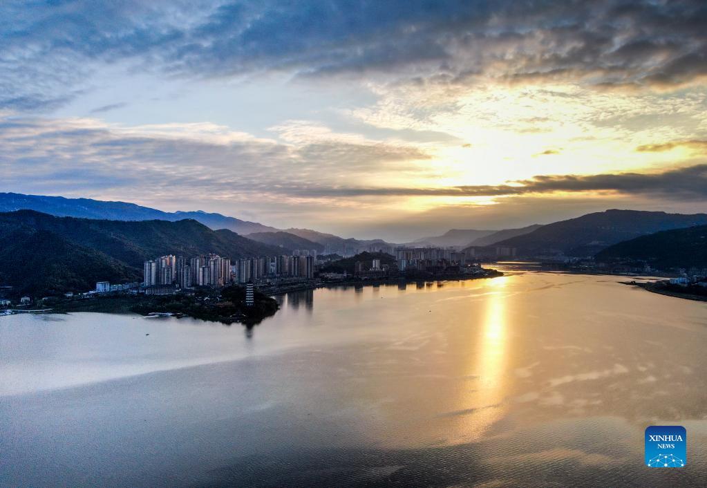 Aerial photo taken on Oct. 18, 2021 shows the sunset scenery of Hanfeng Lake in Kaizhou District of Chongqing, southwest China. (Xinhua/Liu Chan)
