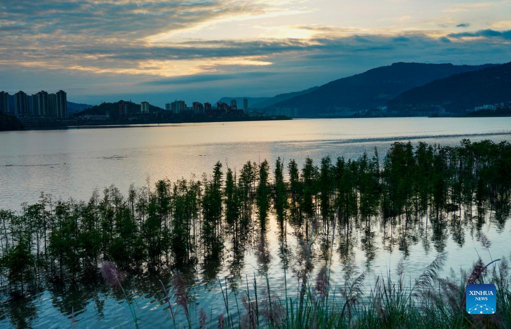 Photo taken on Oct. 18, 2021 shows the sunset scenery of Hanfeng Lake in Kaizhou District of Chongqing, southwest China. (Xinhua/Liu Chan)