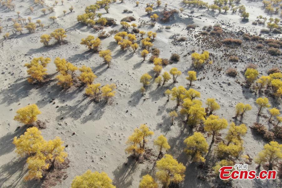 A populus diversifolia forest is seen along a 50-km-long section of Tarim River crossing the north of Taklimakan desert in China's Xinjiang Uygur Autonomous Region.(China News Service/Jiao Yinhui)