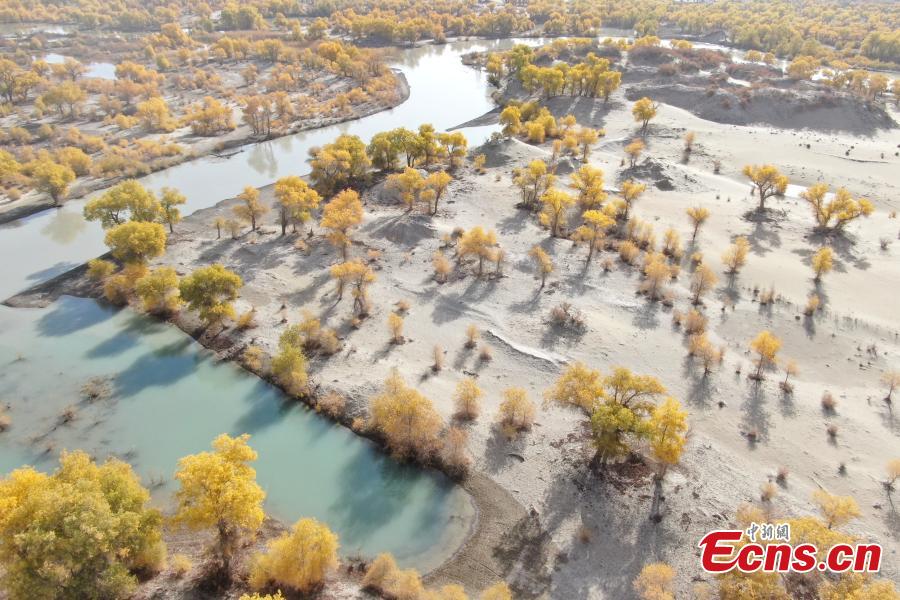 A populus diversifolia forest is seen along a 50-km-long section of Tarim River crossing the north of Taklimakan desert in China's Xinjiang Uygur Autonomous Region.(China News Service/Jiao Yinhui)