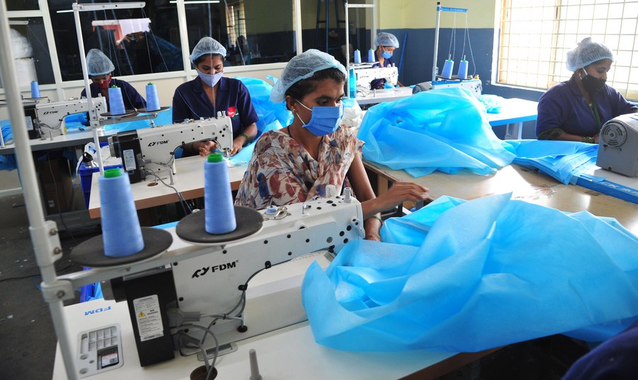 Workers process personal protective equipment (PPE) kits for hospitals at a factory in Bangalore, India, on May 6, 2021. (Str/Xinhua)