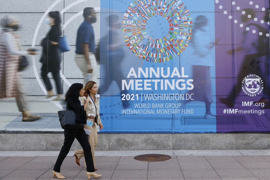 People walk past the International Monetary Fund (IMF) headquarters in Washington, D.C., the United States, Oct. 14, 2021. (Photo by Ting Shen/Xinhua)