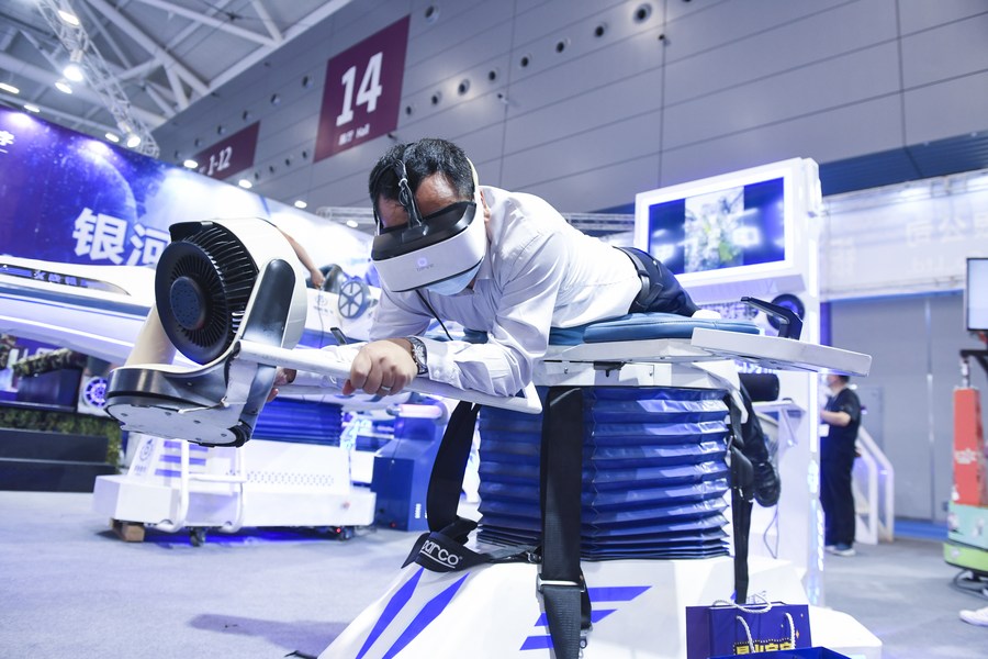 A visitor experiences VR games at the 17th China (Shenzhen) International Cultural Industries Fair (ICIF) in Shenzhen, south China's Guangdong Province, Sept. 23, 2021. (Xinhua/Mao Siqian)