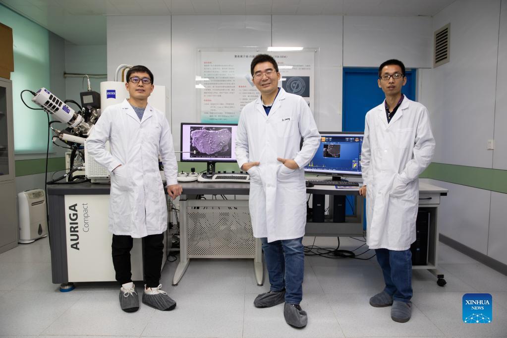 A research team of the Institute of Geology and Geophysics of the Chinese Academy of Sciences poses for a photo in Beijing, capital of China, Oct. 18, 2021. Chinese researchers have studied the lunar samples brought back by the Chang'e-5 mission and dated the youngest rock on the Moon at around 2 billion years in age, extending the "life" of lunar volcanism 800-900 million years longer than previously known. The study, conducted mainly by a research team at the Institute of Geology and Geophysics (IGG), Chinese Academy of Sciences (CAS), was presented in three Nature papers and published online Tuesday. (Xinhua/Jin Liwang)