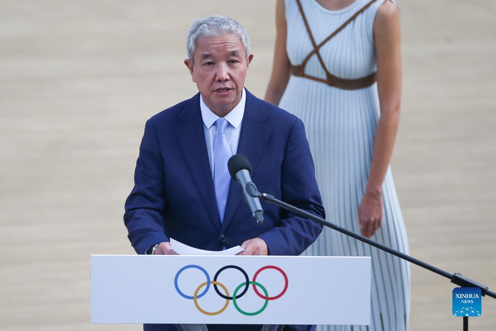 Special representative and Vice-President of Beijing 2022 Yu Zaiqing delivers a speech during the handover ceremony of the Olympic Flame for the Beijing 2022 Winter Olympic Games at the Panathenaic Stadium in Athens, Greece, Oct. 19, 2021. (Xinhua/Zheng Huansong)