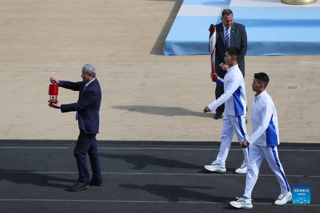 Special representative and Vice-President of Beijing 2022 Yu Zaiqing (1st L) holds up a lantern containing the Olympic Flame during the handover ceremony of the Olympic Flame for the Beijing 2022 Winter Olympic Games at the Panathenaic Stadium in Athens, Greece, Oct. 19, 2021. (Xinhua/Zheng Huansong)