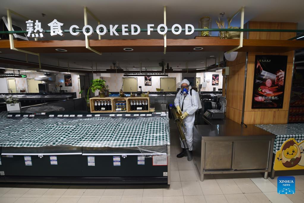 A staff member disinfects a shopping center in Chengguan District of Lanzhou, northwest China's Gansu Province, Oct. 19, 2021. Local authorities have strengthened the prevention and control measures to halt the spread of the coronavirus in the recent COVID-19 resurgence. (Xinhua/Fan Peishen)