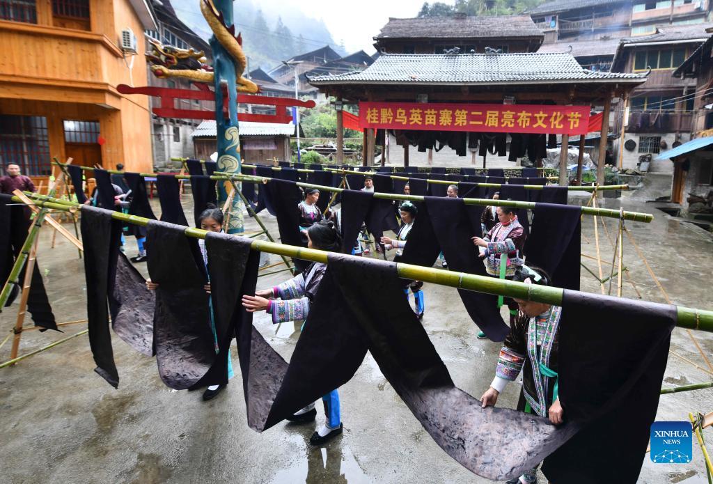 Women of Miao ethnic group display cloth during a "Liang Bu" fair held in Wuying Village, which lies on the border between south China's Guangxi Zhuang Autonomous Region and southwest China's Guizhou Province, on Oct. 19, 2021. "Liang Bu", named for its glistening appearance, is a kind of traditional hand-made cloth of Miao ethnic group. Subject to its complicated producing techniques, "Liang Bu" was once rarely seen. In recent years, it was gradually favored again as the development of local tourism and the improvement in people's awareness of traditional cultural protection. (Xinhua/Huang Xiaobang)