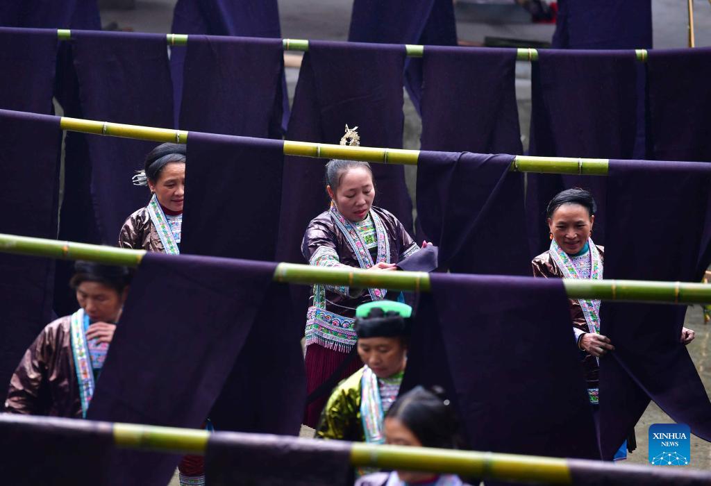 Women of Miao ethnic group display cloth during a "Liang Bu" fair held in Wuying Village, which lies on the border between south China's Guangxi Zhuang Autonomous Region and southwest China's Guizhou Province, on Oct. 19, 2021. "Liang Bu", named for its glistening appearance, is a kind of traditional hand-made cloth of Miao ethnic group. Subject to its complicated producing techniques, "Liang Bu" was once rarely seen. In recent years, it was gradually favored again as the development of local tourism and the improvement in people's awareness of traditional cultural protection. (Xinhua/Huang Xiaobang)
