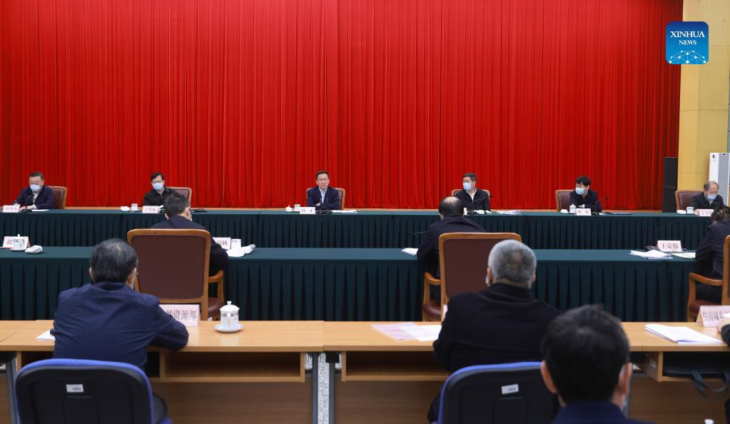 Chinese Vice Premier Han Zheng, also a member of the Standing Committee of the Political Bureau of the Communist Party of China Central Committee, attends a meeting at the National Development and Reform Commission on Oct. 19, 2021. (Xinhua/Ding Lin)
