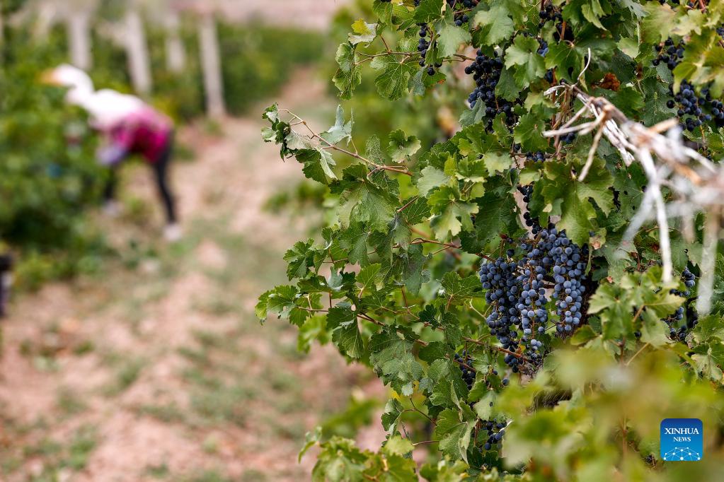 Workers harvest grapes in a vineyard at the eastern foot of Helan Mountain, northwest China's Ningxia Hui Autonomous Region, Oct. 14, 2021. Farmers here are busy picking up wine grapes during the harvest season in the vineyards. With abundant sunshine, rich irrigation and an appropriate climate, Ningxia's vast barren Gobi Desert is deemed the "golden zone" for growing wine grapes. (Xinhua/Feng Kaihua)