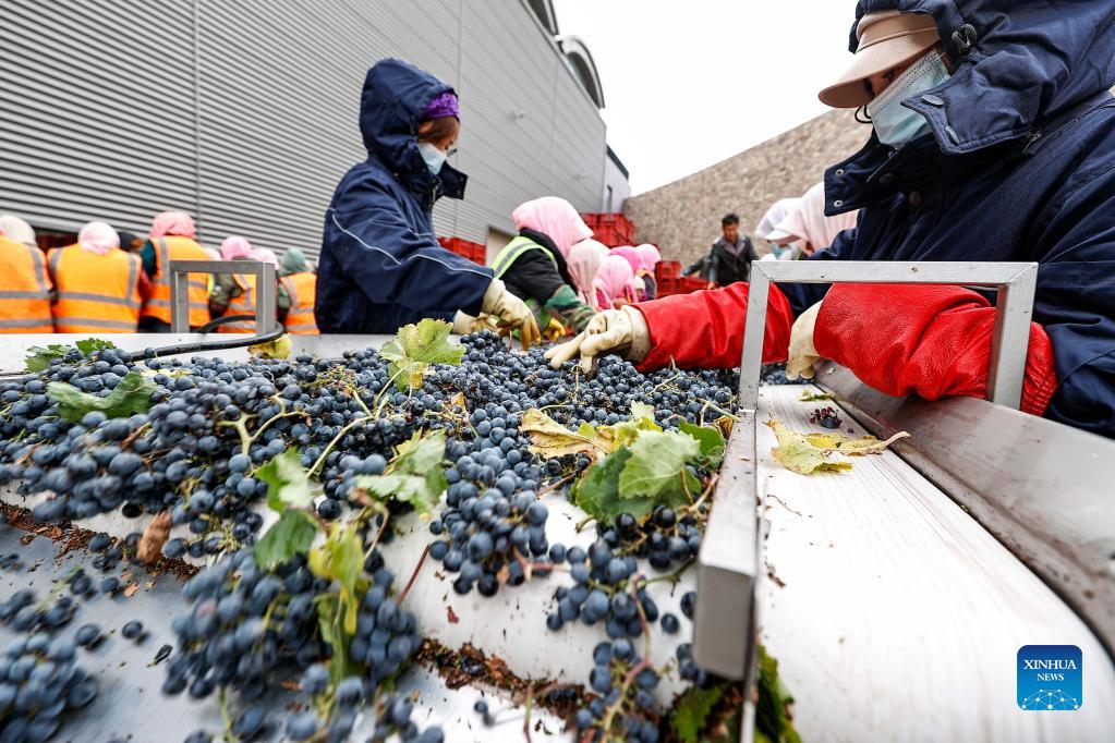 Workers sort grapes in a wine chateau at the eastern foot of Helan Mountain, northwest China's Ningxia Hui Autonomous Region, Oct. 14, 2021. Farmers here are busy picking up wine grapes during the harvest season in the vineyards. With abundant sunshine, rich irrigation and an appropriate climate, Ningxia's vast barren Gobi Desert is deemed the "golden zone" for growing wine grapes. (Xinhua/Feng Kaihua)