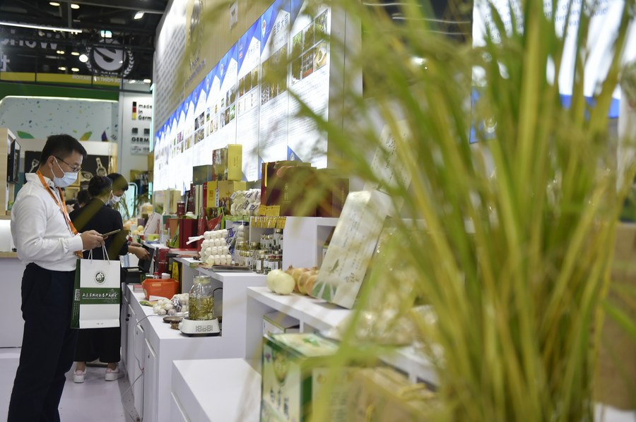 Visitors view agricultural products displayed at the China International Fair for Trade in Services (CIFTIS) in Beijng, capital of China, Sept. 4, 2021. (Xinhua/Lu Peng)