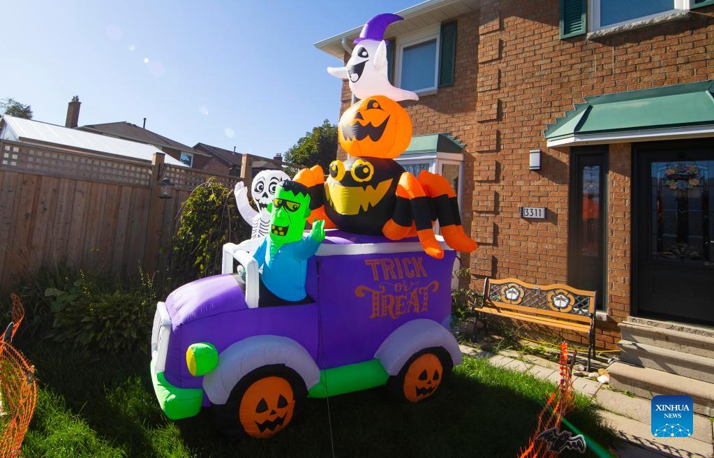 Halloween decorations are seen in front of a house in Mississauga, Ontario, Canada, on Oct. 19, 2021. Some residents in Ontario started to decorate their houses for the upcoming Halloween. (Photo by Zou Zheng/Xinhua)