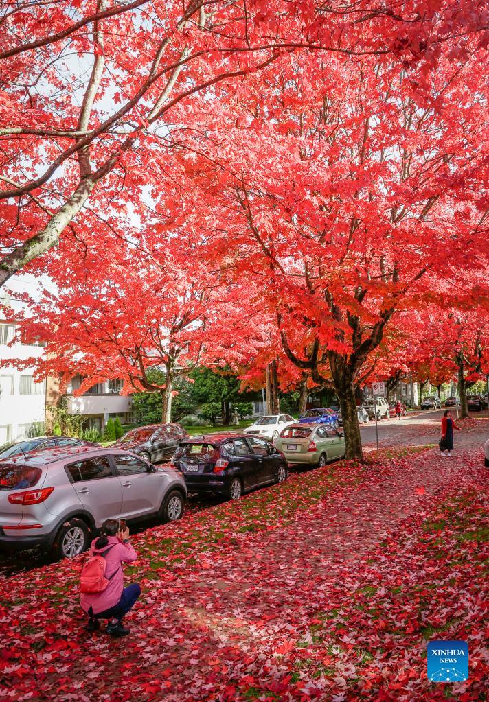 A street is blanketed with the fall foliage in Vancouver, British Columbia, Canada, on Oct. 19, 2021. (Photo by Liang Sen/Xinhua)