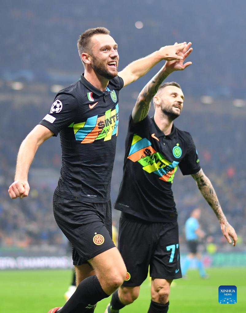 FC Inter's Stefan De Vrij (L) celebrates his goal with his teammate Marcelo Brozovic during the UEFA Champions League Group D match between FC Inter and FC Sheriff Tiraspol in Milan, Italy, Oct. 19, 2021. (Str/Xinhua)