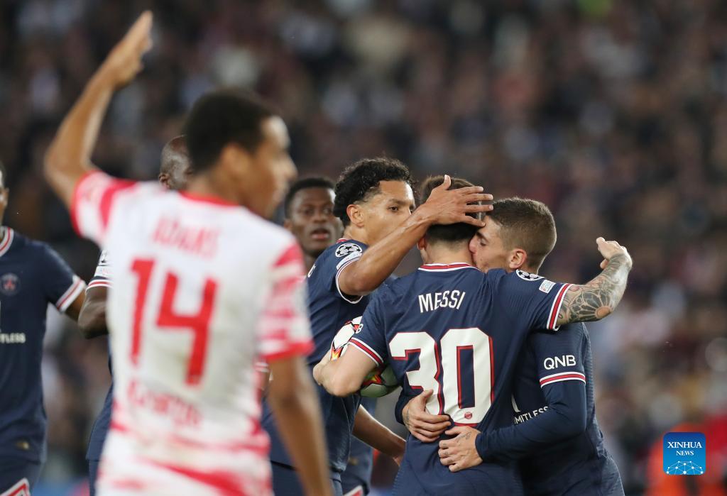 Lionel Messi (2nd R) of Paris Saint-Germain celebrates scoring with his teammates during the Champions League Group A soccer match between Paris Saint-Germain and RB Leipzig at the Parc des Princes in Paris, France, Oct. 19, 2021. (Xinhua/Gao Jing)