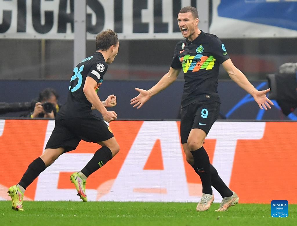 FC Inter's Edin Dzeko (R) celebrates his goal during the UEFA Champions League Group D match between FC Inter and FC Sheriff Tiraspol in Milan, Italy, Oct. 19, 2021. (Str/Xinhua)