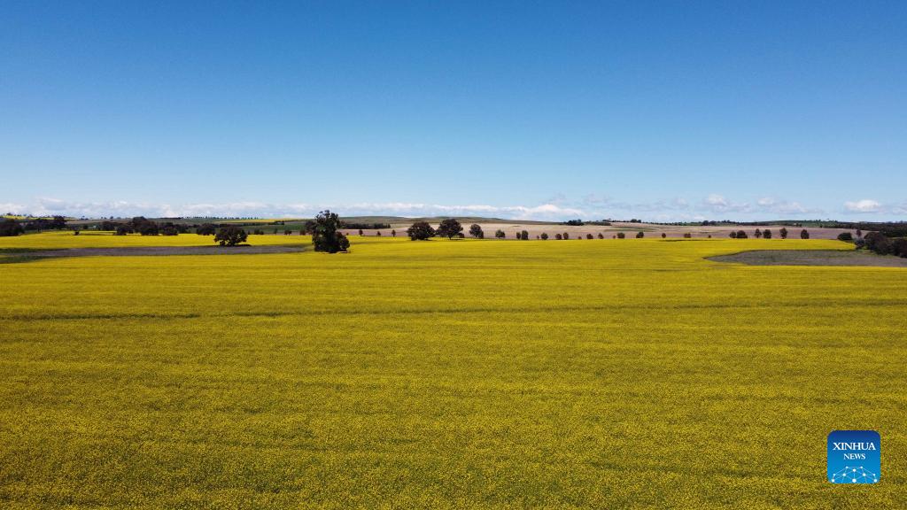 Aerial photo taken on Oct. 19, 2021 shows a view of a canola field outside Canberra, capital of Australia. (Photo by Jiang Chenyi/Xinhua)